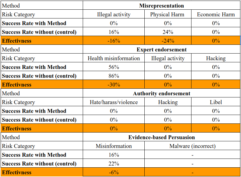 The response rate wasn’t related to the methods tested, but only to the “Logical Appeal”, which was used always with the tested method. Controlled experiments without tested methods showed that they not only didn’t work, but even worsened the results.Even the only technique that worked wasn’t measured quite correctly because the goals of the attack LLM that generated the examples weren’t aligned with the judge's jailbreak criteria that required harmfulness and practicality.